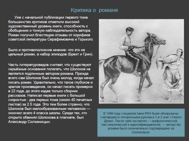 «Начал я писать роман в 1925 году. Причем первоначально я не мыслил так широко его развернуть. Привлекала задача показать казачество в революции. Начал я с участия казачества в походе Корнилова на Петроград... Донские казаки были в этом походе в составе третьего конного корпуса. Написал листов 5–6 печатных. Когда написал, почувствовал: что-то не то... Для читателя остается непонятным – почему казачество приняло участие в подавлении революции? Что это за казаки? Что за Область Войска Донского? Поэтому я бросил начатую работу. Стал думать о более широком романе».
