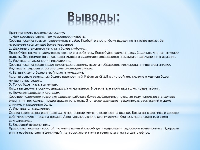 3. Улучшается дыхание и пищеварение. Хорошая осанка увеличивает вместимость легких, помогая обращению кислорода и пищи в организме. Улучшается здоровье, органы функционируют лучше.