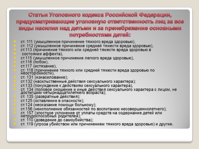Статьи Уголовного кодекса Российской Федерации, предусматривающие уголовную ответственность лиц за все виды насилия над детьми и за пренебрежение основными потребностями детей: