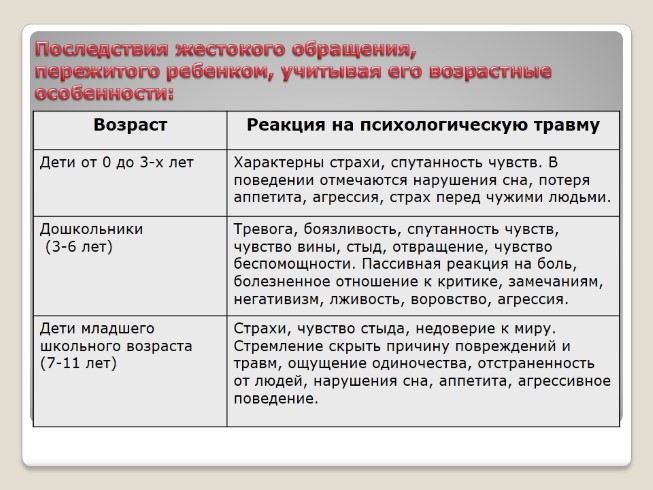 Страхи, чувство стыда, недоверие к миру. Стремление скрыть причину повреждений и травм, ощущение одиночества, отстраненность от людей, нарушения сна, аппетита, агрессивное поведение.