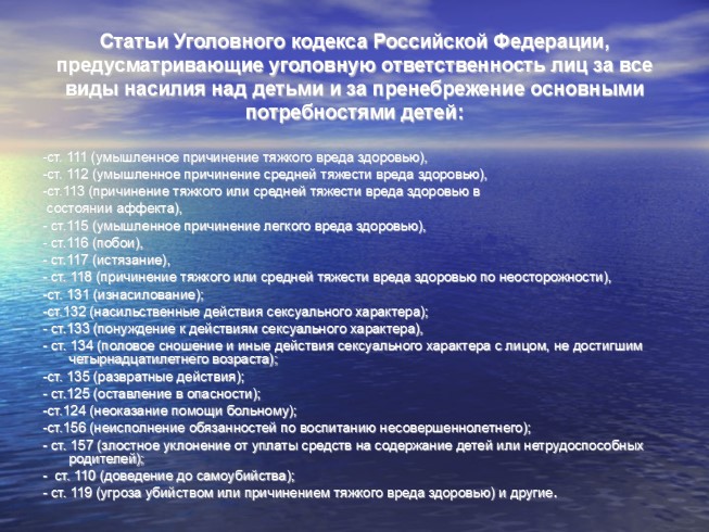 Статьи Уголовного кодекса Российской Федерации, предусматривающие уголовную ответственность лиц за все виды насилия над детьми и за пренебрежение основными потребностями детей: