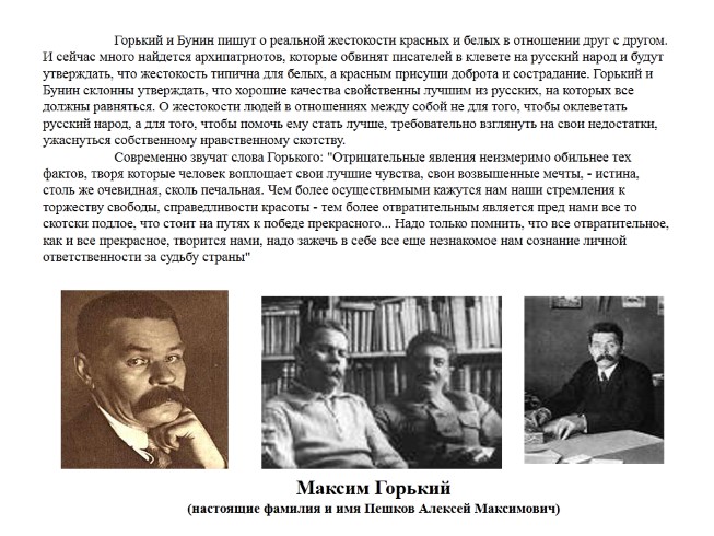 Горький и Бунин пишут о реальной жестокости красных и белых в отношении друг с другом. И сейчас много найдется архипатриотов, которые обвинят писателей в клевете на русский народ и будут утверждать, что жестокость типична для белых, а красным присущи доброта и сострадание. Горький и Бунин склонны утверждать, что хорошие качества свойственны лучшим из русских, на которых все должны равняться. О жестокости людей в отношениях между собой не для того, чтобы оклеветать русский народ, а для того, чтобы помочь ему стать лучше, требовательно взглянуть на свои недостатки, ужаснуться собственному нравственному скотству. Современно звучат слова Горького: "Отрицательные явления неизмеримо обильнее тех фактов, творя которые человек воплощает свои лучшие чувства, свои возвышенные мечты, - истина, столь же очевидная, сколь печальная. Чем более осуществимыми кажутся нам наши стремления к торжеству свободы, справедливости красоты - тем более отвратительным является пред нами все то скотски подлое, что стоит на путях к победе прекрасного... Надо только помнить, что все отвратительное, как и все прекрасное, творится нами, надо зажечь в себе все еще незнакомое нам сознание личной ответственности за судьбу страны"