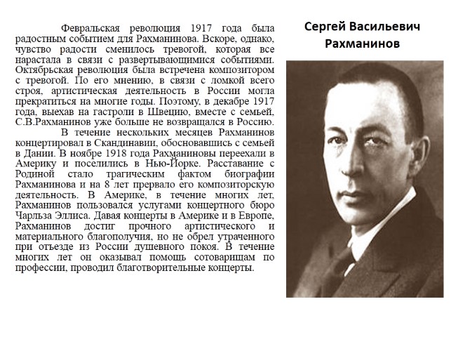 Февральская революция 1917 года была радостным событием для Рахманинова. Вскоре, однако, чувство радости сменилось тревогой, которая все нарастала в связи с развертывающимися событиями. Октябрьская революция была встречена композитором с тревогой. По его мнению, в связи с ломкой всего строя, артистическая деятельность в России могла прекратиться на многие годы. Поэтому, в декабре 1917 года, выехав на гастроли в Швецию, вместе с семьей, С.В.Рахманинов уже больше не возвращался в Россию. В течение нескольких месяцев Рахманинов концертировал в Скандинавии, обосновавшись с семьей в Дании. В ноябре 1918 года Рахманиновы переехали в Америку и поселились в Нью-Йорке. Расставание с Родиной стало трагическим фактом биографии Рахманинова и на 8 лет прервало его композиторскую деятельность. В Америке, в течение многих лет, Рахманинов пользовался услугами концертного бюро Чарльза Эллиса. Давая концерты в Америке и в Европе, Рахманинов достиг прочного артистического и материального благополучия, но не обрел утраченного при отъезде из России душевного покоя. В течение многих лет он оказывал помощь сотоварищам по профессии, проводил благотворительные концерты.