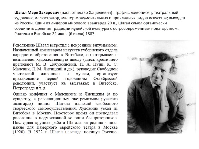 Шагал Марк Захарович (наст. отчество Хацкелевич) - график, живописец, театральный художник, иллюстратор, мастер монументальных и прикладных видов искусства; выходец из России. Один из лидеров мирового авангарда 20 в., Шагал сумел органически соединить древние традиции иудейской культуры с остросовременным новаторством. Родился в Витебске 24 июня (6 июля) 1887.