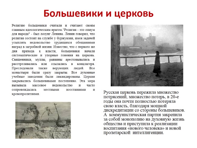 Русская церковь пережила множество потрясений, множество потерь, в 20-е годы она почти полностью потеряла свою власть, благодаря мощной дискредитации со стороны большевиков. А коммунистическая партия закрепила за собой монополию на духовную жизнь общества и приступила к реализации воспитания «нового человека» и новой пролетарской интеллигенции.