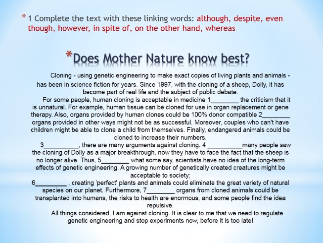 Does Mother Nature know best? Cloning - using genetic engineering to make exact copies of living plants and animals - has been in science fiction for years. Since 1997, with the cloning of a sheep, Dolly, it has become part of real life and the subject of public debate. For some people, human cloning is acceptable in medicine 1________ the criticism that it is unnatural. For example, human tissue can be cloned for use in organ replacement or gene therapy. Also, organs provided by human clones could be 100% donor compatible 2________ organs provided in other ways might not be as successful. Moreover, couples who can't have children might be able to clone a child from themselves. Finally, endangered animals could be cloned to increase their numbers. 3__________, there are many arguments against cloning. 4 __________many people saw the cloning of Dolly as a major breakthrough, now they have to face the fact that the sheep is no longer alive. Thus, 5________ what some say, scientists have no idea of the long-term effects of genetic engineering. A growing number of genetically created creatures might be acceptable to society; 6_________ , creating 'perfect' plants and animals could eliminate the great variety of natural species on our planet. Furthermore, 7________ organs from cloned animals could be transplanted into humans, the risks to health are enormous, and some people find the idea repulsive. All things considered, I am against cloning. It is clear to me that we need to regulate genetic engineering and stop experiments now, before it is too late!