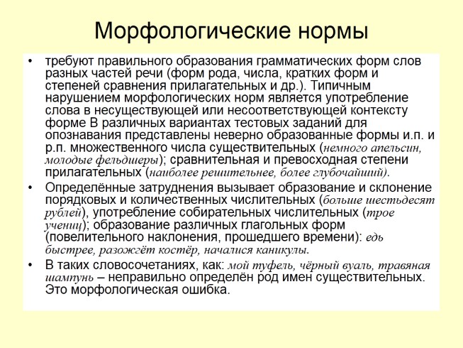 требуют правильного образования грамматических форм слов разных частей речи (форм рода, числа, кратких форм и степеней сравнения прилагательных и др.). Типичным нарушением морфологических норм является употребление слова в несуществующей или несоответствующей контексту форме В различных вариантах тестовых заданий для опознавания представлены неверно образованные формы и.п. и р.п. множественного числа существительных (немного апельсин, молодые фельдшеры); сравнительная и превосходная степени прилагательных (наиболее решительнее, более глубочайший).