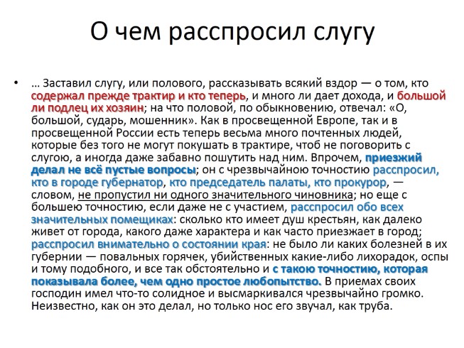 … Заставил слугу, или полового, рассказывать всякий вздор — о том, кто содержал прежде трактир и кто теперь, и много ли дает дохода, и большой ли подлец их хозяин; на что половой, по обыкновению, отвечал: «О, большой, сударь, мошенник». Как в просвещенной Европе, так и в просвещенной России есть теперь весьма много почтенных людей, которые без того не могут покушать в трактире, чтоб не поговорить с слугою, а иногда даже забавно пошутить над ним. Впрочем, приезжий делал не всё пустые вопросы; он с чрезвычайною точностию расспросил, кто в городе губернатор, кто председатель палаты, кто прокурор, — словом, не пропустил ни одного значительного чиновника; но еще с большею точностию, если даже не с участием, расспросил обо всех значительных помещиках: сколько кто имеет душ крестьян, как далеко живет от города, какого даже характера и как часто приезжает в город; расспросил внимательно о состоянии края: не было ли каких болезней в их губернии — повальных горячек, убийственных какие-либо лихорадок, оспы и тому подобного, и все так обстоятельно и с такою точностию, которая показывала более, чем одно простое любопытство. В приемах своих господин имел что-то солидное и высмаркивался чрезвычайно громко. Неизвестно, как он это делал, но только нос его звучал, как труба.