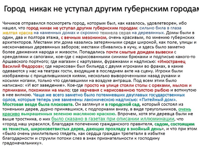 Чичиков отправился посмотреть город, которым был, как казалось, удовлетворен, ибо нашел, что город никак не уступал другим губернским городам: сильно била в глаза желтая краска на каменных домах и скромно темнела серая на деревянных. Домы были в один, два и полтора этажа, с вечным мезонином, очень красивым, по мнению губернских архитекторов. Местами эти дома казались затерянными среди широкой, как поле, улицы и нескончаемых деревянных заборов; местами сбивались в кучу, и здесь было заметно более движения народа и живости. Попадались почти смытые дождем вывески с кренделями и сапогами, кое-где с нарисованными синими брюками и подписью какого-то Аршавского портного; где магазин с картузами, фуражками и надписью: «Иностранец Василий Федоров»; где нарисован был бильярд с двумя игроками во фраках, в какие одеваются у нас на театрах гости, входящие в последнем акте на сцену. Игроки были изображены с прицелившимися киями, несколько вывороченными назад руками и косыми ногами, только что сделавшими на воздухе антраша. Под всем этим было написано: «И вот заведение». Кое-где просто на улице стояли столы с орехами, мылом и пряниками, похожими на мыло; где харчевня с нарисованною толстою рыбою и воткнутою в нее вилкою. Чаще же всего заметно было потемневших двуглавых государственных орлов, которые теперь уже заменены лаконическою надписью: «Питейный дом». Мостовая везде была плоховата. Он заглянул и в городской сад, который состоял из тоненьких дерев, дурно принявшихся, с подпорками внизу, в виде треугольников, очень красиво выкрашенных зеленою масляною краскою. Впрочем, хотя эти деревца были не выше тростника, о них было сказано в газетах при описании иллюминации, что «город наш украсился, благодаря попечению гражданского правителя, садом, состоящим из тенистых, широковетвистых дерев, дающих прохладу в знойный день», и что при этом «было очень умилительно глядеть, как сердца граждан трепетали в избытке благодарности и струили потоки слез в знак признательности к господину градоначальнику».