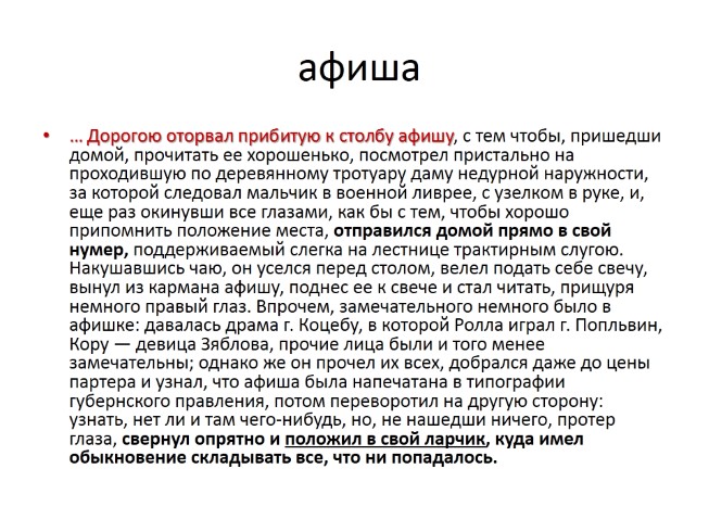… Дорогою оторвал прибитую к столбу афишу, с тем чтобы, пришедши домой, прочитать ее хорошенько, посмотрел пристально на проходившую по деревянному тротуару даму недурной наружности, за которой следовал мальчик в военной ливрее, с узелком в руке, и, еще раз окинувши все глазами, как бы с тем, чтобы хорошо припомнить положение места, отправился домой прямо в свой нумер, поддерживаемый слегка на лестнице трактирным слугою. Накушавшись чаю, он уселся перед столом, велел подать себе свечу, вынул из кармана афишу, поднес ее к свече и стал читать, прищуря немного правый глаз. Впрочем, замечательного немного было в афишке: давалась драма г. Коцебу, в которой Ролла играл г. Попльвин, Кору — девица Зяблова, прочие лица были и того менее замечательны; однако же он прочел их всех, добрался даже до цены партера и узнал, что афиша была напечатана в типографии губернского правления, потом переворотил на другую сторону: узнать, нет ли и там чего-нибудь, но, не нашедши ничего, протер глаза, свернул опрятно и положил в свой ларчик, куда имел обыкновение складывать все, что ни попадалось.