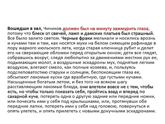 Вошедши в зал, Чичиков должен был на минуту зажмурить глаза, потому что блеск от свечей, ламп и дамских платьев был страшный. Все было залито светом. Черные фраки мелькали и носились врознь и кучами там и там, как носятся мухи на белом сияющем рафинаде в пору жаркого июльского лета, когда старая ключница рубит и делит его на сверкающие обломки перед открытым окном; дети все глядят, собравшись вокруг, следя любопытно за движениями жестких рук ее, подымающих молот, а воздушные эскадроны мух, поднятые легким воздухом, влетают смело, как полные хозяева, и, пользуясь подслеповатостию старухи и солнцем, беспокоящим глаза ее, обсыпают лакомые куски где вразбитную, где густыми кучами. Насыщенные богатым летом, и без того на всяком шагу расставляющим лакомые блюда, они влетели вовсе не с тем, чтобы есть, но чтобы только показать себя, пройтись взад и вперед по сахарной куче, потереть одна о другую задние или передние ножки, или почесать ими у себя под крылышками, или, протянувши обе передние лапки, потереть ими у себя над головою, повернуться и опять улететь, и опять прилететь с новыми докучными эскадронами.