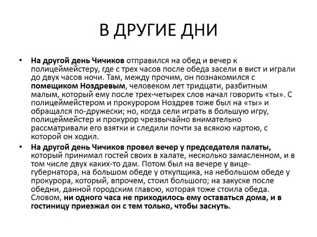 На другой день Чичиков провел вечер у председателя палаты, который принимал гостей своих в халате, несколько замасленном, и в том числе двух каких-то дам. Потом был на вечере у вице-губернатора, на большом обеде у откупщика, на небольшом обеде у прокурора, который, впрочем, стоил большого; на закуске после обедни, данной городским главою, которая тоже стоила обеда. Словом, ни одного часа не приходилось ему оставаться дома, и в гостиницу приезжал он с тем только, чтобы заснуть.