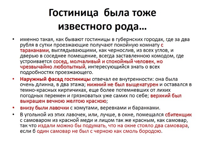 именно такая, как бывают гостиницы в губернских городах, где за два рубля в сутки проезжающие получают покойную комнату с тараканами, выглядывающими, как чернослив, из всех углов, и дверью в соседнее помещение, всегда заставленною комодом, где устроивается сосед, молчаливый и спокойный человек, но чрезвычайно любопытный, интересующийся знать о всех подробностях проезжающего.
