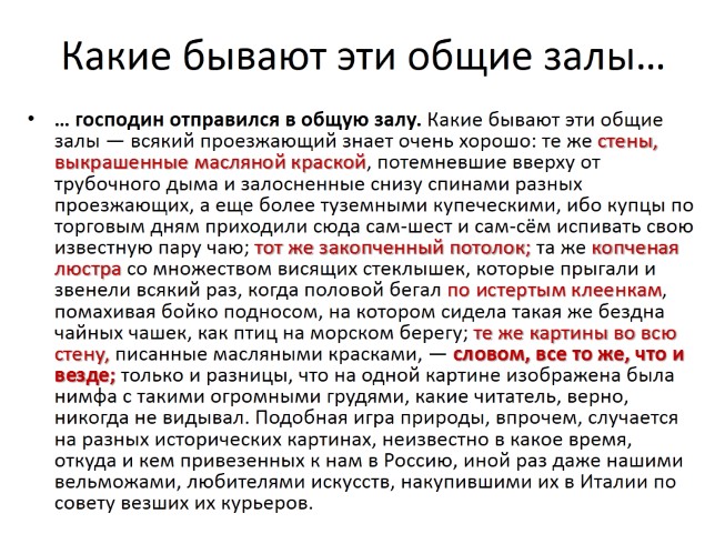 … господин отправился в общую залу. Какие бывают эти общие залы — всякий проезжающий знает очень хорошо: те же стены, выкрашенные масляной краской, потемневшие вверху от трубочного дыма и залосненные снизу спинами разных проезжающих, а еще более туземными купеческими, ибо купцы по торговым дням приходили сюда сам-шест и сам-сём испивать свою известную пару чаю; тот же закопченный потолок; та же копченая люстра со множеством висящих стеклышек, которые прыгали и звенели всякий раз, когда половой бегал по истертым клеенкам, помахивая бойко подносом, на котором сидела такая же бездна чайных чашек, как птиц на морском берегу; те же картины во всю стену, писанные масляными красками, — словом, все то же, что и везде; только и разницы, что на одной картине изображена была нимфа с такими огромными грудями, какие читатель, верно, никогда не видывал. Подобная игра природы, впрочем, случается на разных исторических картинах, неизвестно в какое время, откуда и кем привезенных к нам в Россию, иной раз даже нашими вельможами, любителями искусств, накупившими их в Италии по совету везших их курьеров.
