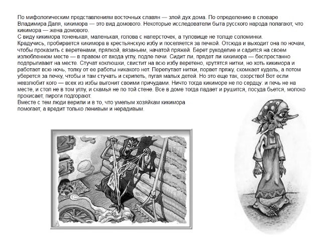 Крадучись, пробирается кикимора в крестьянскую избу и поселяется за печкой. Отсюда и выходит она по ночам, чтобы проказить с веретенами, прялкой, вязаньем, начатой пряжей. Берет рукоделие и садится на своем излюбленном месте — в правом от входа углу, подле печи. Сидит ли, прядет ли кикимора — беспрестанно подпрыгивает на месте. Стучат коклюшки, свистит на всю избу веретено, крутятся нитки, но хоть кикимора и работает всю ночь, толку от ее работы никакого нет. Перепутает нитки, порвет пряжу, скомкает кудель, а потом уберется за печку, чтобы и там стучать и скрипеть, пугая малых детей. Но это еще так, озорство! Вот если невзлюбит кого — всех из избы выгонит своими причудами. Ничто тогда кикиморе не по сердцу: и печь не на месте, и стол не в том углу, и скамья не по той стене. Все в доме тогда падает и рушится, посуда бьется, молоко прокисает, пироги подгорают.