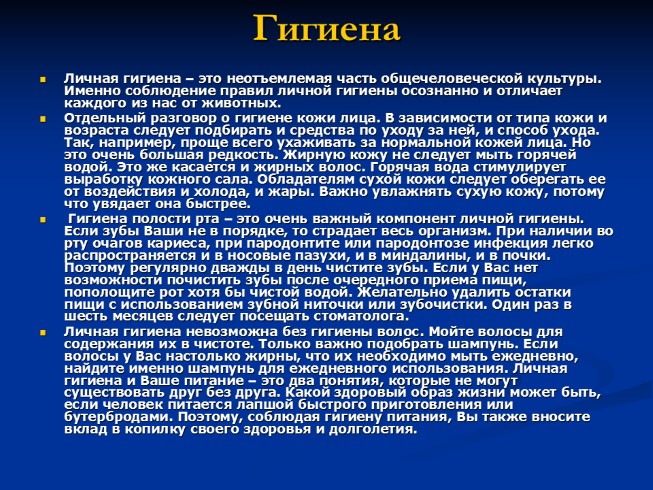 Личная гигиена невозможна без гигиены волос. Мойте волосы для содержания их в чистоте. Только важно подобрать шампунь. Если волосы у Вас настолько жирны, что их необходимо мыть ежедневно, найдите именно шампунь для ежедневного использования. Личная гигиена и Ваше питание – это два понятия, которые не могут существовать друг без друга. Какой здоровый образ жизни может быть, если человек питается лапшой быстрого приготовления или бутербродами. Поэтому, соблюдая гигиену питания, Вы также вносите вклад в копилку своего здоровья и долголетия.