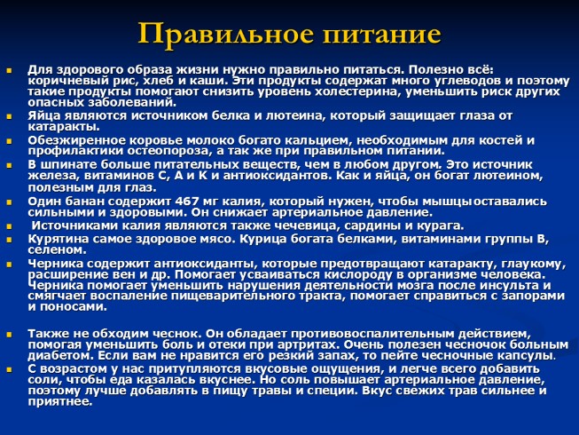 Для здорового образа жизни нужно правильно питаться. Полезно всё: коричневый рис, хлеб и каши. Эти продукты содержат много углеводов и поэтому такие продукты помогают снизить уровень холестерина, уменьшить риск других опасных заболеваний.