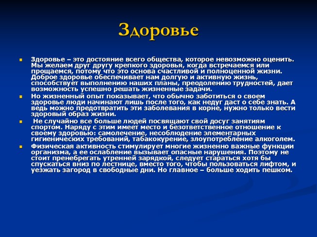Здоровье – это достояние всего общества, которое невозможно оценить. Мы желаем друг другу крепкого здоровья, когда встречаемся или прощаемся, потому что это основа счастливой и полноценной жизни. Доброе здоровье обеспечивает нам долгую и активную жизнь, способствует выполнению наших планы, преодолению трудностей, дает возможность успешно решать жизненные задачи.
