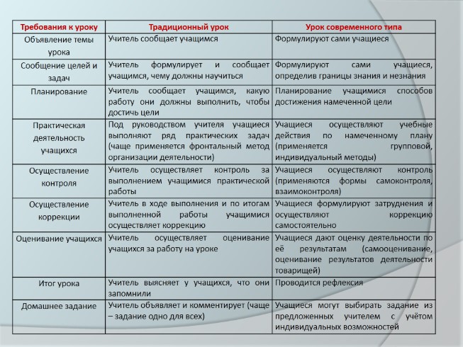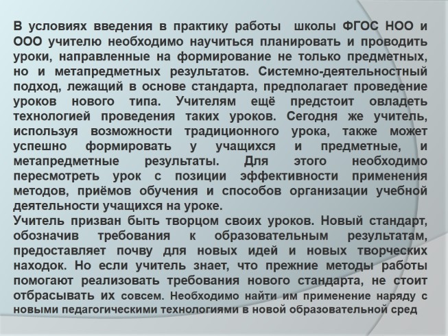 В условиях введения в практику работы школы ФГОС НОО и ООО учителю необходимо научиться планировать и проводить уроки, направленные на формирование не только предметных, но и метапредметных результатов. Системно-деятельностный подход, лежащий в основе стандарта, предполагает проведение уроков нового типа. Учителям ещё предстоит овладеть технологией проведения таких уроков. Сегодня же учитель, используя возможности традиционного урока, также может успешно формировать у учащихся и предметные, и метапредметные результаты. Для этого необходимо пересмотреть урок с позиции эффективности применения методов, приёмов обучения и способов организации учебной деятельности учащихся на уроке.
