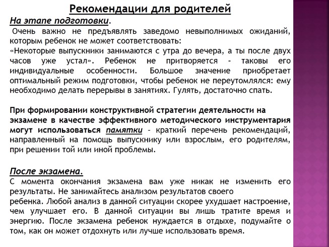 экзамене в качестве эффективного методического инструментария могут использоваться памятки – краткий перечень рекомендаций, направленный на помощь выпускнику или взрослым, его родителям, при решении той или иной проблемы.