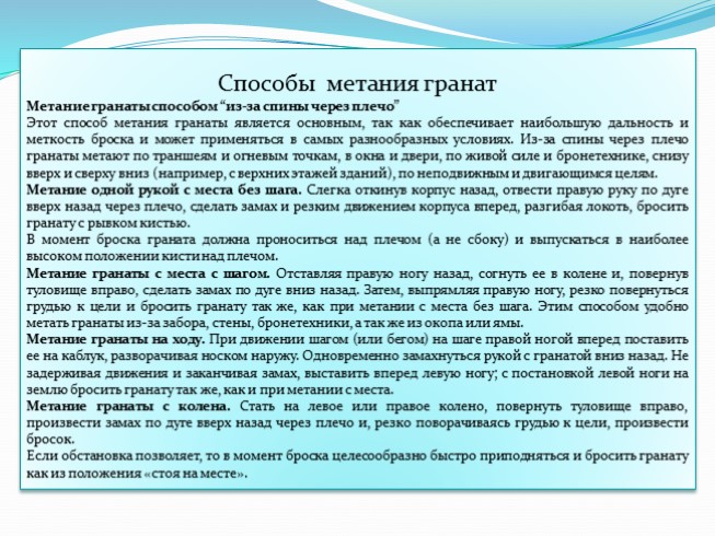 Если обстановка позволяет, то в момент броска целесообразно быстро приподняться и бросить гранату как из положения «стоя на месте».