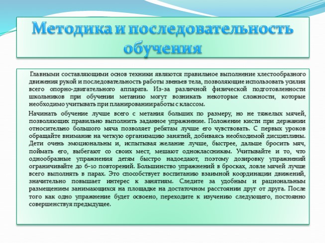 Главными составляющими основ техники являются правильное выполнение хлестообразного движения рукой и последовательность работы звеньев тела, позволяющие использовать усилия всего опорно-двигательного аппарата. Из-за различной физической подготовленности школьников при обучении метанию могут возникать некоторые сложности, которые необходимо учитывать при планировании работы с классом.
