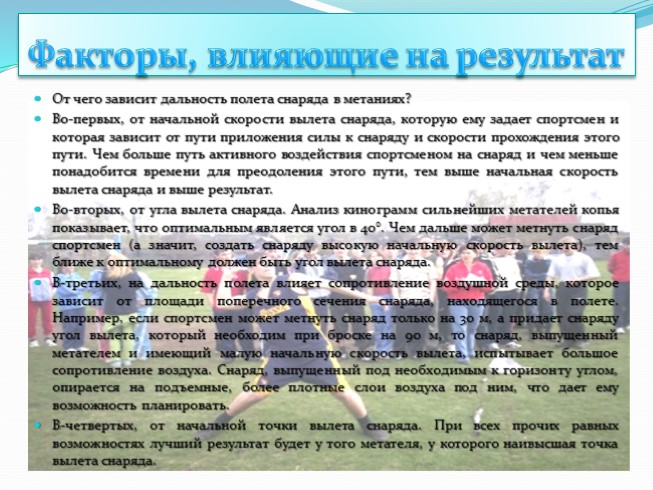 Во-первых, от начальной скорости вылета снаряда, которую ему задает спортсмен и которая зависит от пути приложения силы к снаряду и скорости прохождения этого пути. Чем больше путь активного воздействия спортсменом на снаряд и чем меньше понадобится времени для преодоления этого пути, тем выше начальная скорость вылета снаряда и выше результат.