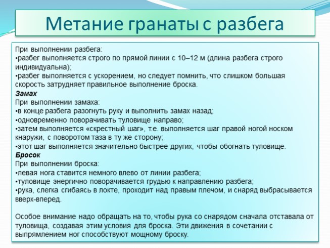 Метание одной рукой с места без шага. Слегка откинув корпус назад, отвести правую руку по дуге вверх назад через плечо, сделать замах и резким движением корпуса вперед, разгибая локоть, бросить гранату с рывком кистью.