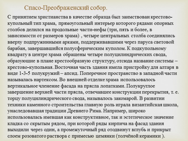 С принятием христианства в качестве образца был заимствован крестово-купольный тип храма, прямоугольный интерьер которого рядами опорных столбов делился на продольные части-нефы (три, пять и более, в зависимости от размеров храма) , четыре центральных столба соединялись вверху подпружинными арками, поддерживавшими через паруса световой барабан, завершавшийся полусферическим куполом. К подкупольному квадрату в центре храма обращены четыре полуцилиндрических свода, образующие в плане крестообразную структуру, отсюда название системы – крестово-купольная. Восточная часть здания имела пристройку для алтаря в виде 1-3-5 полукружий – апсид. Поперечное пространство в западной части называлась нартексом. Во внешней отделке храма использовалось вертикальное членение фасада на прясла лопатками. Полукруглое завершение верхней части прясла, отвечавшее конструкции перекрытия, т. е. торцу полуцилиндрического свода, называлось закомарой. В развитии техники каменного строительства главную роль играла византийская школа, унаследовавшая традиции Древнего Рима. Например, широко использовалась имевшая как конструктивное, так и эстетическое значение кладка со скрытым рядом, при которой ряды кирпича на фасад здания выходили через один, а промежуточный ряд отодвинут вглубь и прикрыт слоем розоватого раствора с примесью цемянки (толчёной керамики ).