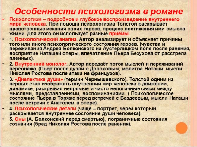 1. Психологический анализ. Автор анализирует и объясняет причины того или иного психологического состояния героев. (чувства и переживания Андрея Болконского на Аустерлицком поле после ранения, восприятие Наташей оперы, впечатление Пьера Безухова от расстрела пленных).