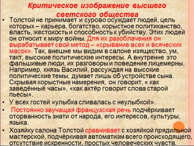Толстой не принимает и сурово осуждает людей, цель которых – карьера, богатство, корыстное политиканство, власть, жестокость и способность к убийству. Этих людей он относит к миру войны. Для их разоблачения он вырабатывает свой метод – «срывание всех и всяческих масок». Так, внешне мы видим в салоне изящество, ум, такт, высокие политические интересы. А внутренне это фальшивые люди, их разговоры и поведение лицемерны. Например, князь Василий, рассуждая на высокие политические темы, думает лишь об устройстве сына. Скрывая корыстные намерения, он говорит, « как заведённыё часы», «как актёр говорит слова старой пьесы».
