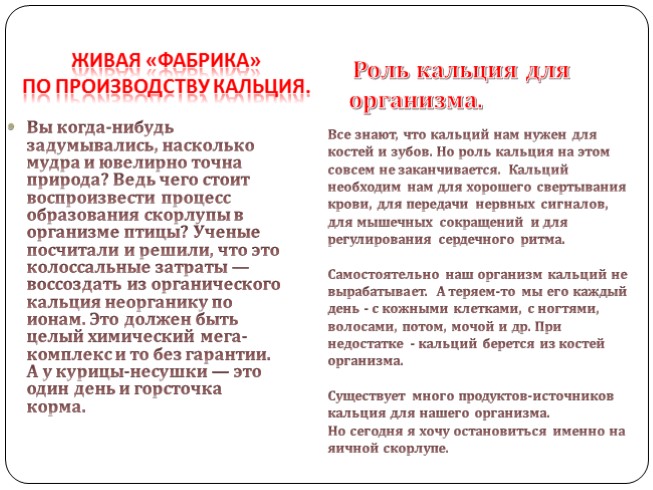 Все знают, что кальций нам нужен для костей и зубов. Но роль кальция на этом совсем не заканчивается. Кальций необходим нам для хорошего свертывания крови, для передачи нервных сигналов, для мышечных сокращений и для регулирования сердечного ритма. Самостоятельно наш организм кальций не вырабатывает. А теряем-то мы его каждый день - с кожными клетками, с ногтями, волосами, потом, мочой и др. При недостатке - кальций берется из костей организма. Существует много продуктов-источников кальция для нашего организма. Но сегодня я хочу остановиться именно на яичной скорлупе.