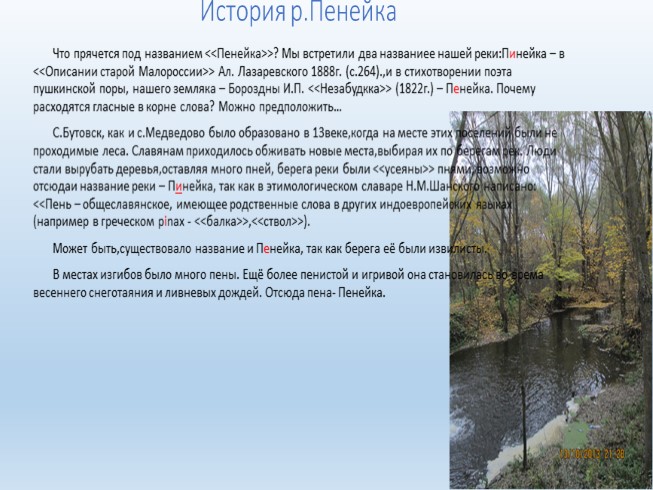 Что прячется под названием <<Пенейка>>? Мы встретили два названиее нашей реки:Пинейка – в <<Описании старой Малороссии>> Ал. Лазаревского 1888г. (с.264).,и в стихотворении поэта пушкинской поры, нашего земляка – Бороздны И.П. <<Незабудкка>> (1822г.) – Пенейка. Почему расходятся гласные в корне слова? Можно предположить…