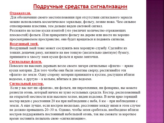 ♦ находитесь подальше от других людей и от легковоспламеняющихся предметов, храните эти средства в ящиках, которые защищены от ударов и осадков, подавайте сигнал с максимально близкого расстояния и только тогда, когда есть уверенность, что его заметят;