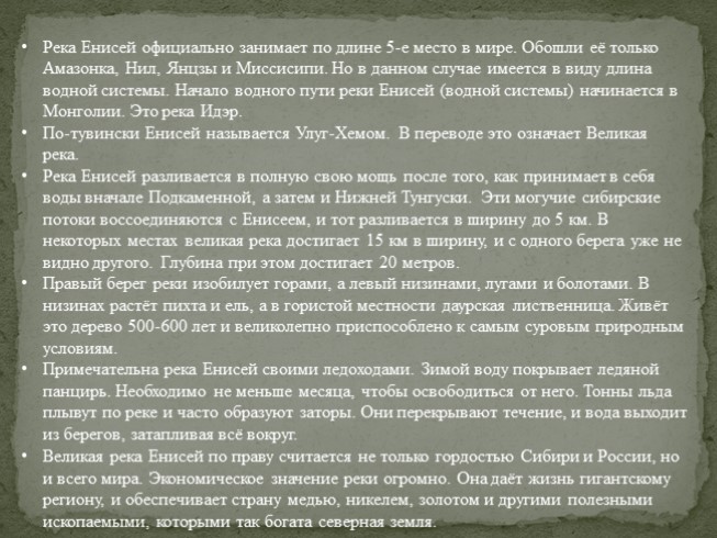 Великая река Енисей по праву считается не только гордостью Сибири и России, но и всего мира. Экономическое значение реки огромно. Она даёт жизнь гигантскому региону, и обеспечивает страну медью, никелем, золотом и другими полезными ископаемыми, которыми так богата северная земля.