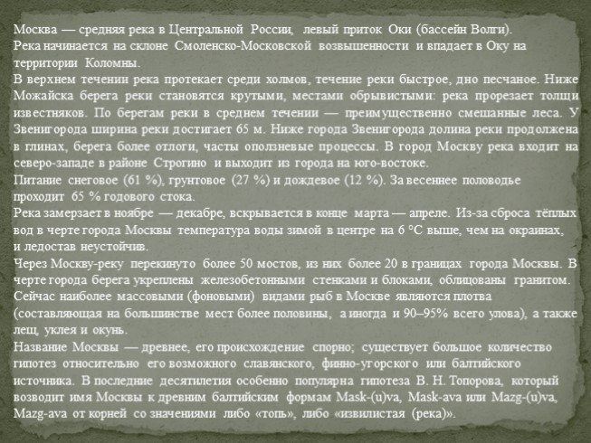 Москва — средняя река в Центральной России, левый приток Оки (бассейн Волги).