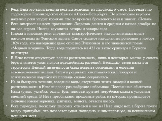 Река Нева это единственная река вытекающая из Ладожского озера. Протекает по территории Ленинградской области и Санкт-Петербурга. По некоторым версиям название реки уходит корнями еще во времена бронзового века и значит: «Новая».