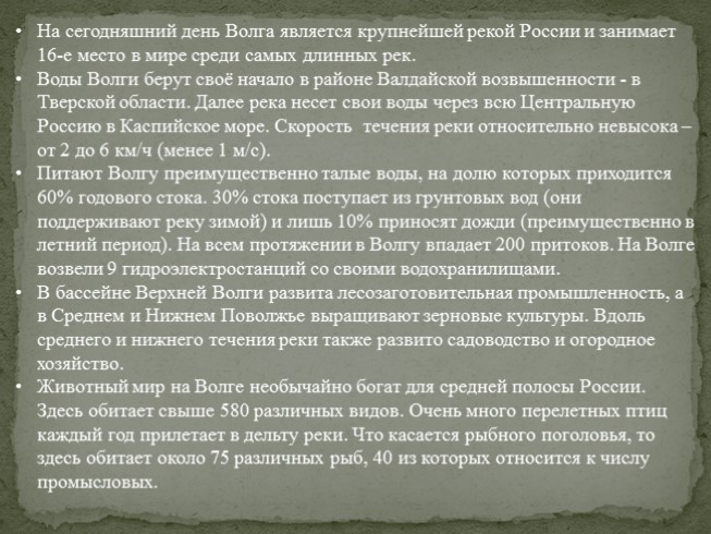 На сегодняшний день Волга является крупнейшей рекой России и занимает 16-е место в мире среди самых длинных рек.