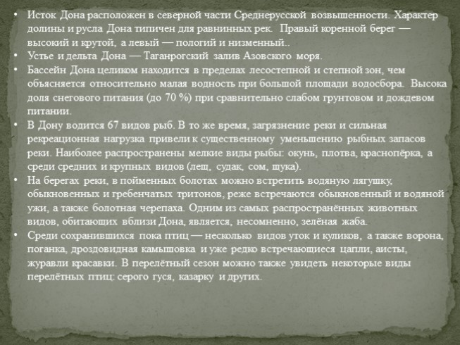 Исток Дона расположен в северной части Среднерусской возвышенности. Характер долины и русла Дона типичен для равнинных рек. Правый коренной берег — высокий и крутой, а левый — пологий и низменный..