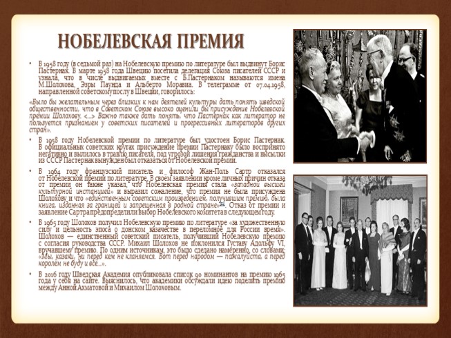 В 1964 году французский писатель и философ Жан-Поль Сартр отказался от Нобелевской премии по литературе. В своём заявлении кроме личных причин отказа от премии он также указал, что Нобелевская премия стала «западной высшей культурной инстанцией» и выразил сожаление, что премия не была присуждена Шолохову и что «единственным советским произведением, получившим премию, была книга, изданная за границей и запрещенная в родной стране»[11]. Отказ от премии и заявление Сартра предопределили выбор Нобелевского комитета в следующем году.