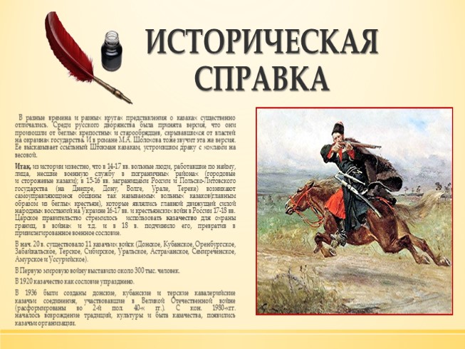 Итак, из истории известно, что в 14-17 вв. вольные люди, работавшие по найму, лица, несшие военную службу в пограничных районах (городовые и сторожевые казаки); в 15-16 вв. заграницами России и Польско-Литовского государства (на Днепре, Дону, Волге, Урале, Тереке) возникают самоуправляющиеся общины так называемых вольных казаков(главным образом из беглых крестьян), которые являлись главной движущей силой народных восстаний на Украине 16-17 вв. и крестьянских войн в России 17-18 вв. Царское правительство стремилось использовать казачество для охраны границ, в войнах и т.д. и в 18 в. подчинило его, превратив в привилегированное военное сословие.