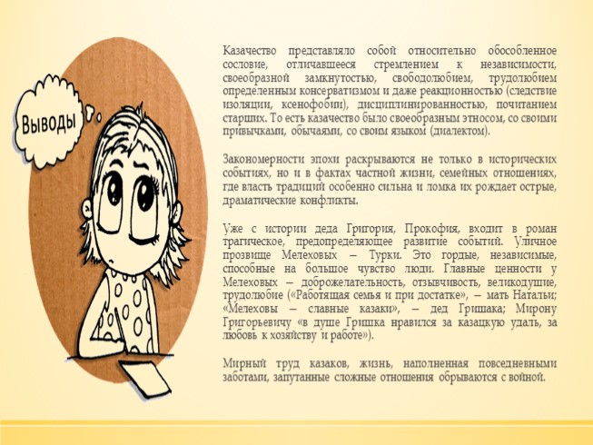 Итак, давайте с вами зачитаем отрывки из романа-эпопеи «Тихий Дон», в которых М.Шоолхов описывает жизнь семей казаков: