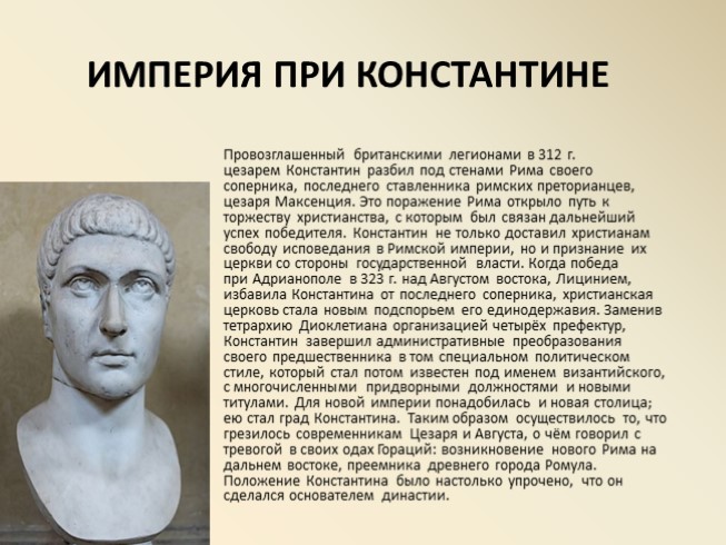 Провозглашенный британскими легионами в 312 г. цезарем Константин разбил под стенами Рима своего соперника, последнего ставленника римских преторианцев, цезаря Максенция. Это поражение Рима открыло путь к торжеству христианства, с которым был связан дальнейший успех победителя. Константин не только доставил христианам свободу исповедания в Римской империи, но и признание их церкви со стороны государственной власти. Когда победа при Адрианополе в 323 г. над Августом востока, Лицинием, избавила Константина от последнего соперника, христианская церковь стала новым подспорьем его единодержавия. Заменив тетрархию Диоклетиана организацией четырёх префектур, Константин завершил административные преобразования своего предшественника в том специальном политическом стиле, который стал потом известен под именем византийского, с многочисленными придворными должностями и новыми титулами. Для новой империи понадобилась и новая столица; ею стал град Константина. Таким образом осуществилось то, что грезилось современникам Цезаря и Августа, о чём говорил с тревогой в своих одах Гораций: возникновение нового Рима на дальнем востоке, преемника древнего города Ромула. Положение Константина было настолько упрочено, что он сделался основателем династии.