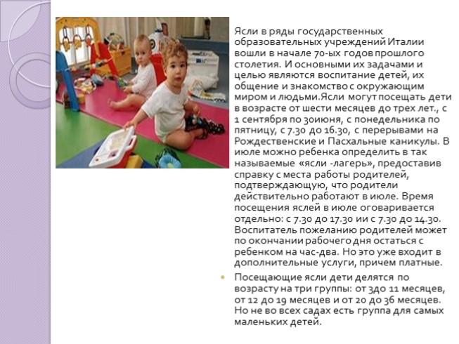 Ясли в ряды государственных образовательных учреждений Италии вошли в начале 70-ых годов прошлого столетия. И основными их задачами и целью являются воспитание детей, их общение и знакомство с окружающим миром и людьми.Ясли могут посещать дети в возрасте от шести месяцев до трех лет., с 1 сентября по 30июня, с понедельника по пятницу, с 7.30 до 16.30, с перерывами на Рождественские и Пасхальные каникулы. В июле можно ребенка определить в так называемые «ясли -лагерь», предоставив справку с места работы родителей, подтверждающую, что родители действительно работают в июле. Время посещения яслей в июле оговаривается отдельно: с 7.30 до 17.30 ии с 7.30 до 14.30. Воспитатель пожеланию родителей может по окончании рабочего дня остаться с ребенком на час-два. Но это уже входит в дополнительные услуги, причем платные.