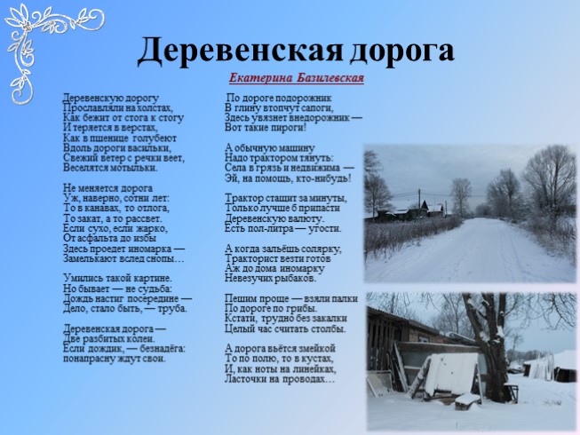 Деревенскую дорогу Прославляли на холстах, Как бежит от стога к стогу И теряется в верстах, Как в пшенице голубеют Вдоль дороги васильки, Свежий ветер с речки веет, Веселятся мотыльки. Не меняется дорога Уж, наверно, сотни лет: То в канавах, то отлога, То закат, а то рассвет. Если сухо, если жарко, От асфальта до избы Здесь проедет иномарка — Замелькают вслед снопы… Умились такой картине. Но бывает — не судьба: Дождь настиг посередине — Дело, стало быть, — труба. Деревенская дорога — Две разбитых колеи. Если дождик, — безнадёга: понапрасну ждут свои.