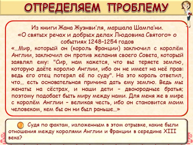«…Мир, который он (король Франции) заключил с королём Англии, заключил он против желания своего Совета, который заявлял ему: "Сир, нам кажется, что вы теряете землю, которую даёте королю Англии, ибо он не имеет на неё прав: ведь его отец потерял её по суду". На это король ответил, что… есть основательная причина дать ему землю. Ведь мы женаты на сёстрах, и наши дети – двоюродные братья; поэтому подобает быть миру между нами. Для меня же в мире с королём Англии – великая честь, ибо он становится моим человеком, кем бы он ни был раньше…»