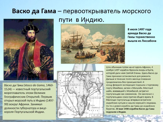Ва́ско да Га́ма (Vasco da Gama, 1460-1524) — известный португальский мореплаватель эпохи Великих Географических Открытий. Первым открыл морской путь в Индию (1497-99) вокруг Африки. Занимал должности губернатора и вице-короля Португальской Индии.