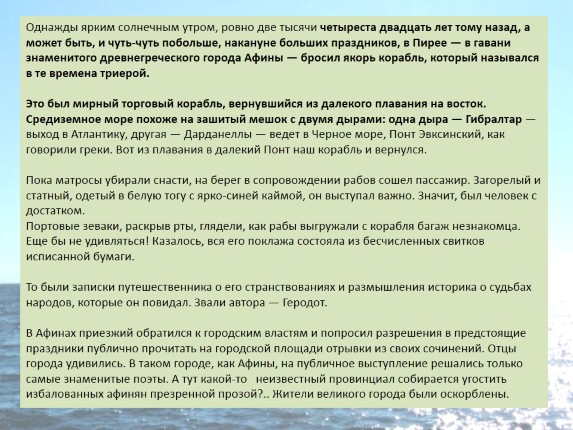 Они потребовали, чтобы власти наградили Геродота, чтобы ему выдали такую премию, какой еще не получал ни один поэт. И никто не посмел отказать народу.