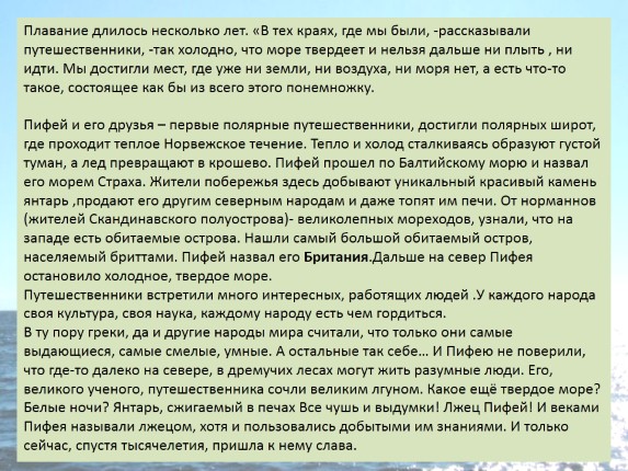 Пифей и его друзья – первые полярные путешественники, достигли полярных широт, где проходит теплое Норвежское течение. Тепло и холод сталкиваясь образуют густой туман, а лед превращают в крошево. Пифей прошел по Балтийскому морю и назвал его морем Страха. Жители побережья здесь добывают уникальный красивый камень янтарь ,продают его другим северным народам и даже топят им печи. От норманнов (жителей Скандинавского полуострова)- великолепных мореходов, узнали, что на западе есть обитаемые острова. Нашли самый большой обитаемый остров, населяемый бриттами. Пифей назвал его Британия.Дальше на север Пифея остановило холодное, твердое море.