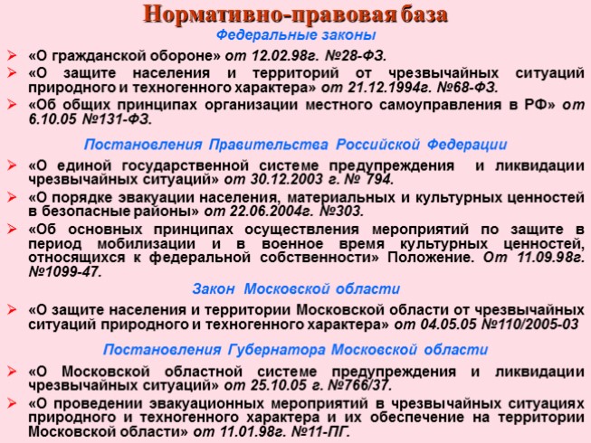 «О проведении эвакуационных мероприятий в чрезвычайных ситуациях природного и техногенного характера и их обеспечение на территории Московской области» от 11.01.98г. №11-ПГ.